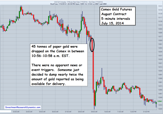 Between July 14 and July 15, contracts representing 126 tonnes of gold was sold in a 14-minute time window which took the price of gold down $43 dollars. No other market showed any unusual or extraordinary movement during this period.